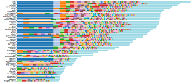 This image shows the top 50 Witnesses, and the coloured bars represent the SP size of the vote. The dark blue bar is @freedom, and it looks like if you have a vote from him as Witness, you almost certainly going to be in the top 50.