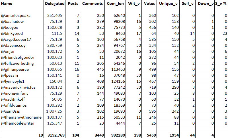 The list excludes 'community' accounts like @utopian-io, @spaminator, @minnowsupport, etc, and my alt. :P I have left in 2 'family' accounts though.
