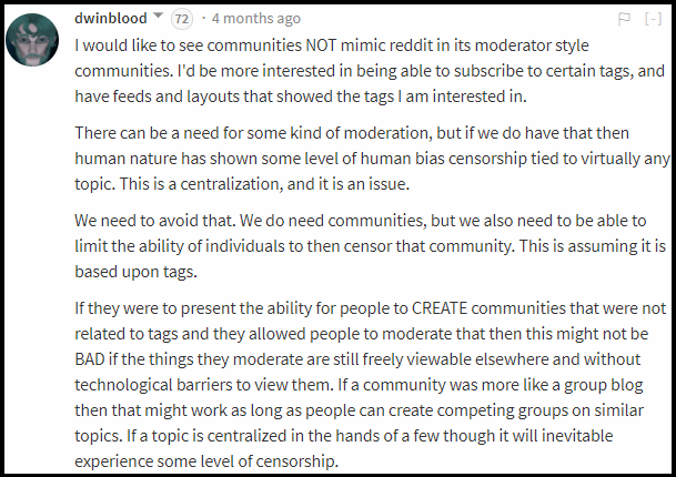 To enable this, we intend to augment our current tag-based organizational structure for posts with a new system called “communities”, a special group into which others can post articles. Two types of communities will exist: communities into which anyone in the world can post (where community founders (or their delegated moderators) can decide, post-hoc, which posts to hide from view) or communities in which only community founders’ (or their delegated authors’) posts will appear.