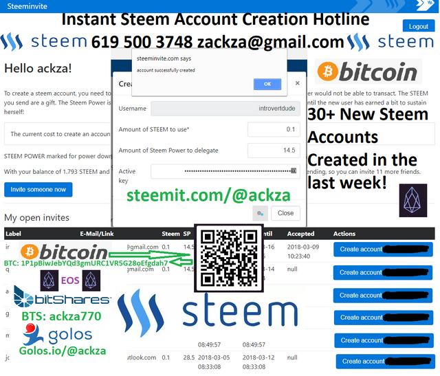 I am currently delegating over 348 Steempower just to help on board new steem users who have been waiting for days, weeks and even months in many cases with no response from steemit, so I am effectively doing the job of Steemit Inc for them and I am grateful for this opportunity and wish them luck on Hardfork20 Communities and SMTs. Steemit Inc is doing SO much work for us that we SHOULD pick up the slack when we can, and if I am able to earn post rewards on steemit posts like this one ABOUT my Account Creation Service, then I can cover the fees of signing up as many people as I can find on Reddit or other social media!. They are eventually going to have accounts approved automatically one day this year so until then I will continue to spend my money to help create instant accounts for new users. Most of them are coming from reddit where they see my reddit Post where I gave out a Steem Account Creation Hotline (A google Hangouts number I created for dealing with crypto people with questions about Stem or Bitcoin). Serious potential Steem users can Apply for a Free Steem Account by texting me their story of waiting or wanting a steem account, and an email to send the instant invite link to. I use the https://steeminvite.com tool by the wonderful Steem Developer @pharesim so Please show your support for him if you like my post. Https://steemit.com/steeminvite/@pharesim/steeminvite-is-back