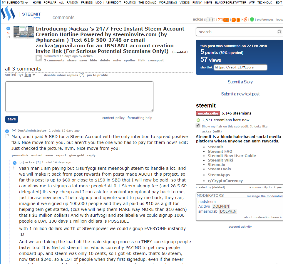 If you would like to help this process of getting the word out about instant Signups to regain the trust of disenchanted consumers, if you want to hel;p steem get its momentum back and recharge the minds of people who feel they've been forgotten by steemit inc, then please show support for my reddit Post all about @ackza 's Instant Steem Account Hotline where I buy new users a free steem account in exchange for a follow and maybe some upvotes in the future :D