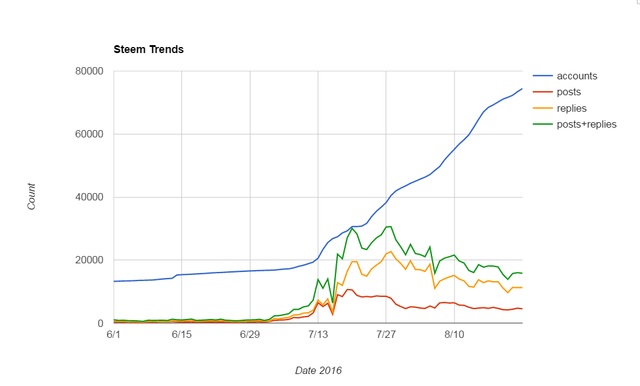While the number of accounts keeps increasing linearly, the number of posts and comments are decreasing every day. The number of posts and comments per user account show a steeper downtrend as you can imagine.