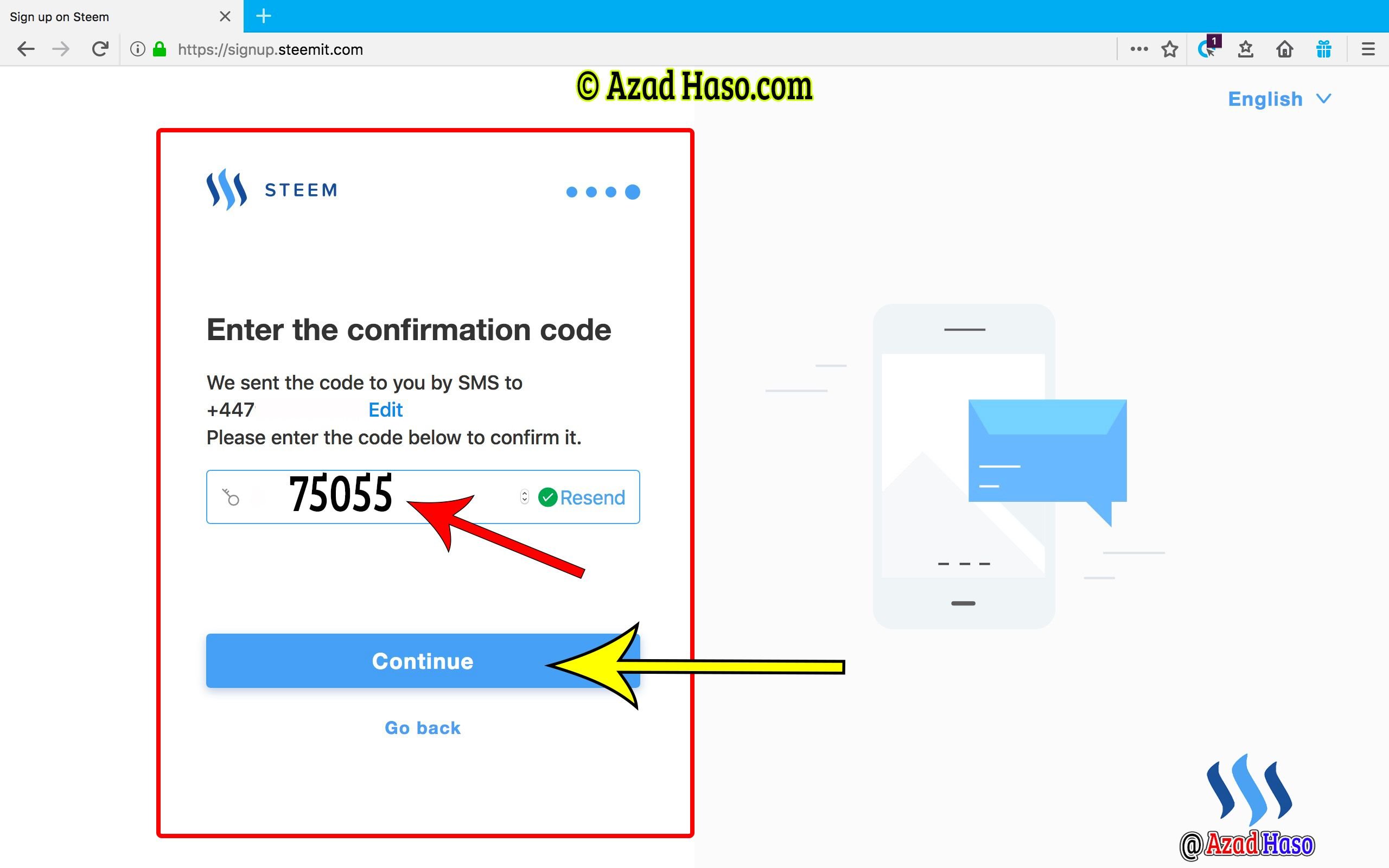 Step 7: Check your mobile phone for a text message from STEEM
