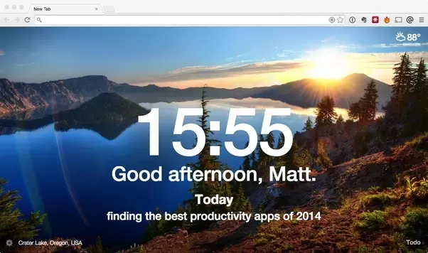Upon opening a new tab, instead of the boring, regular new tab, how about getting a tab with to do list, quote of the day, favorite links and beautiful background image?