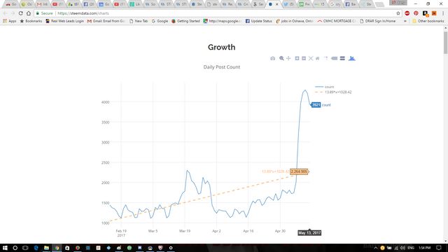 Daily Post Count Climbing : 3921 posts if you cannot read the # I was hovering over there and you can see the orange dotted line showing the low marks, trending upwards steadily: