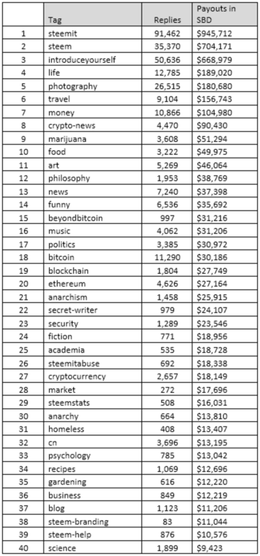 What cannot be determined from these stats is which tag results in the highest average post payout. Now that would be really interesting. Regardless, it gives you a good idea of what tags are rewarded the most.