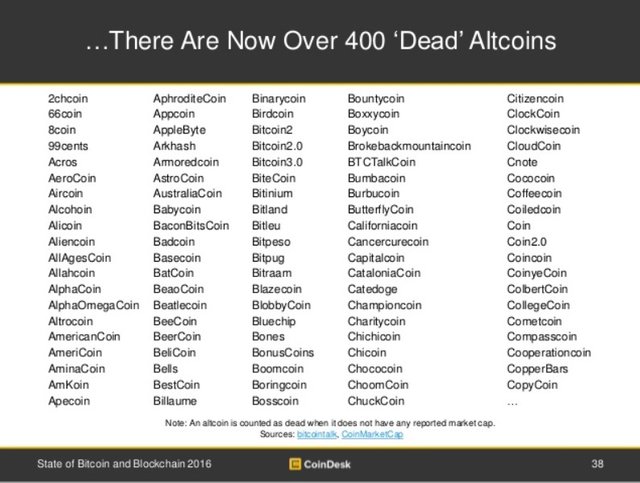 Despite the popularity of the phenomenon, many alternative cryptocurrency immediately sank into oblivion (today their market value does not rise above 0 $). In 2015, a report was presented CoinDesk State of Bitcoin and Blockchain, where there are up to 400 "dead" alternative coins. It is to be expected, since Bitcoin compete with, if not impossible, it is extremely difficult, because this system has been a pioneer and, in fact, helped to consolidate in society the concept cryptocurrency itself.