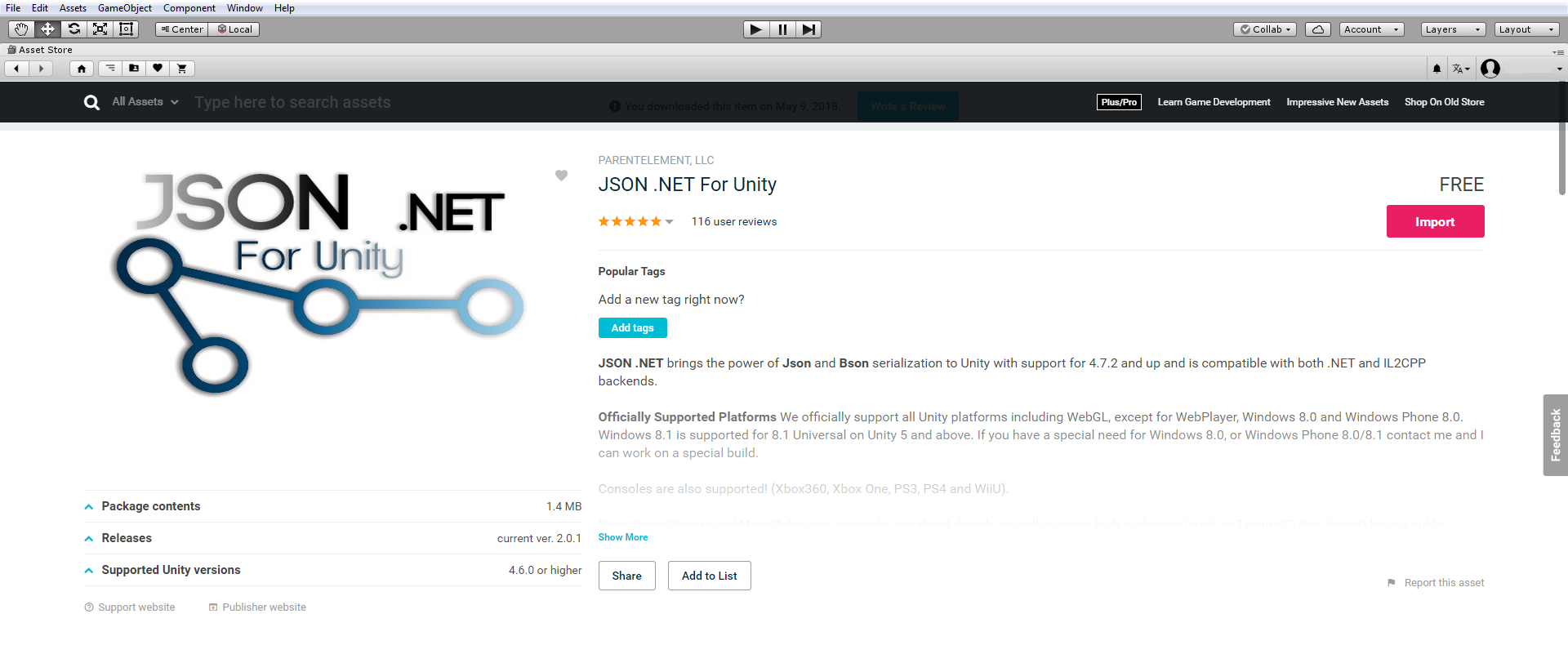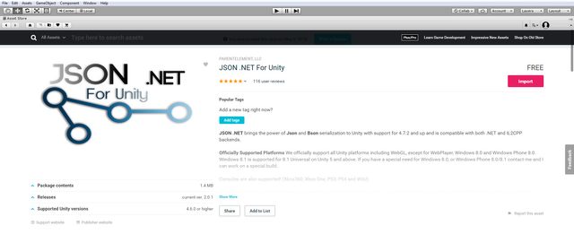 Next step is fix the error with "arrParams". We need Newtonsoft.Json.dll, but for Unity. In Asset Store we have to find a JSON .NET For Unity and import it.