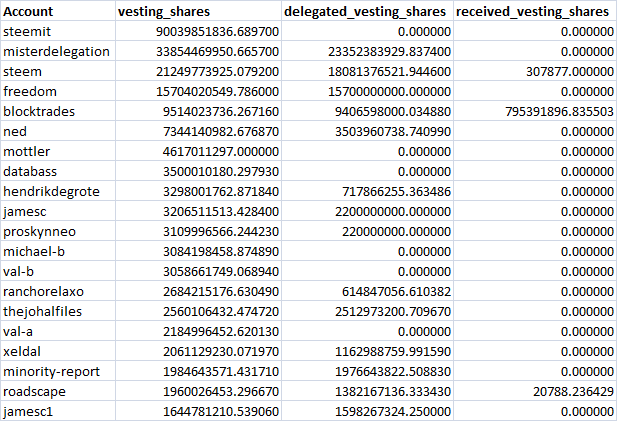 Now, let's see the same 20 accounts with additional details of their delegated vesting shares and received vesting shares from others.