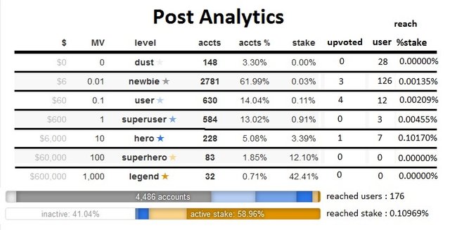 So you would understand you had a ratio of one upvote from every 3 views , great , but you reached only 12 "user" level accounts. Anyways , you reached 0.00209% of the total stake and received 0.00069% stake from upvotes.