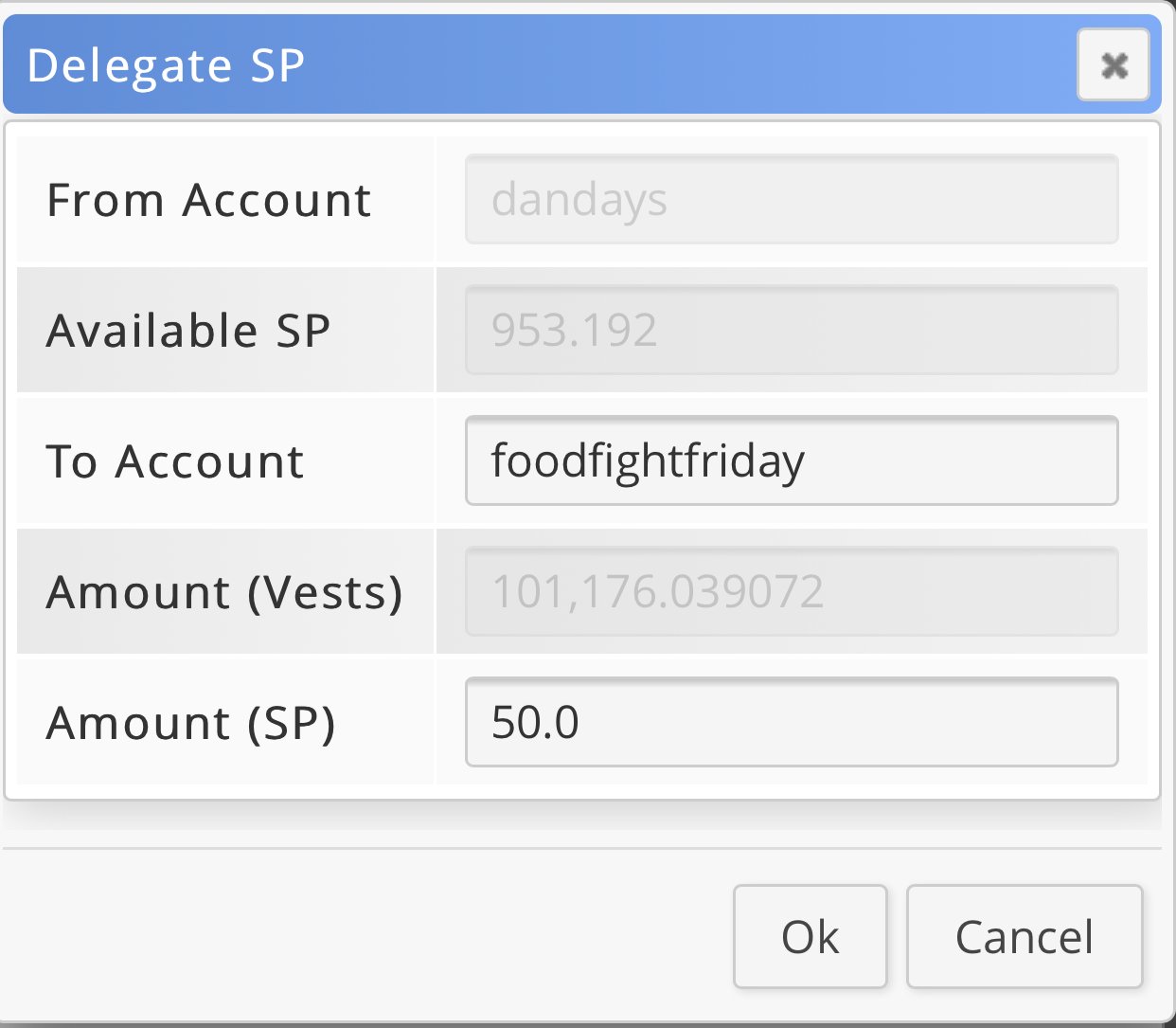 Type the recipients name into the “To Account” line without the ‘@‘ symbol. Then type in the amount you’d like to delegate; 50.0, 100.0, 300.0 etc. (identifying the Satoshi is required) and click “Ok.”