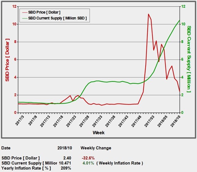 Look at where the green line is beginning to rise sharply. That was when they increased either A) the sell-off of SBD (don't know by whom, maybe Steemit itself or a couple of whales) or it was B) that they increased the inflation from close to zero to 4% per week.