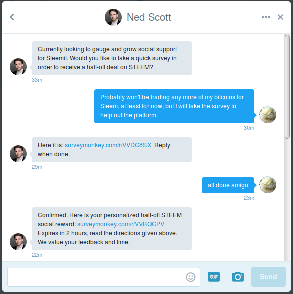 I was followed by who I thought was Ned Scott, on Twitter, so I immediately followed back thinking "I could've sworn I was already following him." The twitter account @certianassets then private messaged me asking if I wanted to take a survey for a half-off deal on steem and I obliged saying: