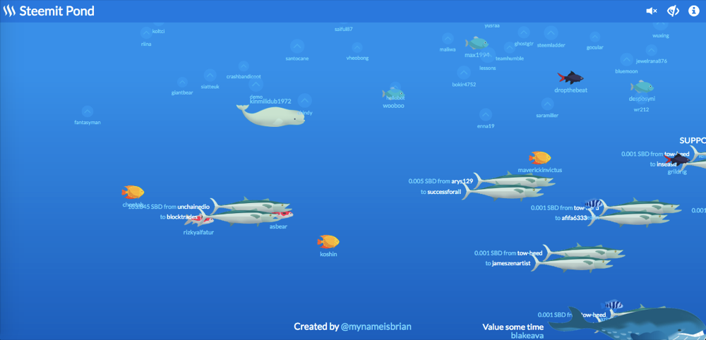 This is a very entertaining and creative way to see the Steem blockchain transactions as fish in a pond and your own transactions as scuba divers. You can click on any of the graphics and it will go to Steemit.