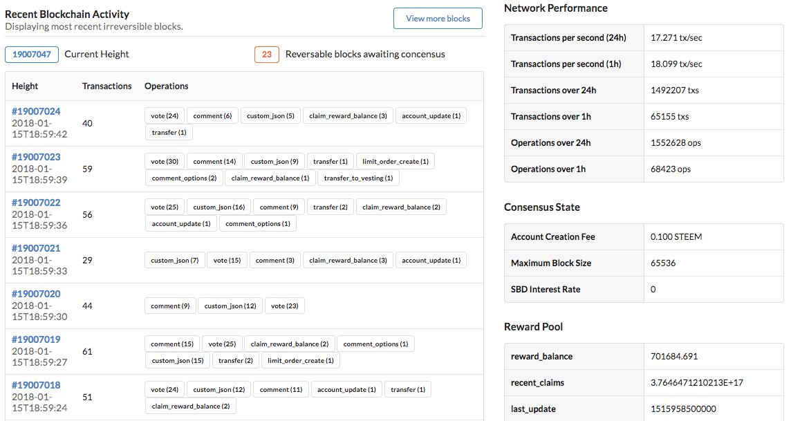 SteemDB is a block explorer and database for the STEEM blockchain. You can see things like recent blockchain activity and network performance. Pretty crazy to see that almost 1.5 million transactions have happened in the past 24 hours!