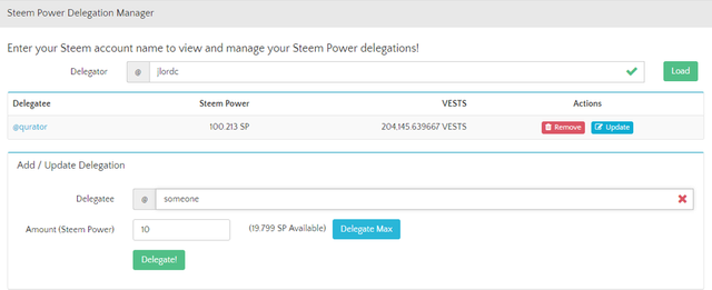 SteembotTracker is not only for placing bids on upvote bots. There are also some other useful tools you can use there, one of which is their Delegation Manager. Not only is it solely for delegating, but it's also for checking, updating and even removing delegations you have already given to someone.