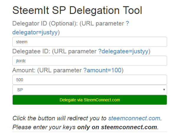 So if you want to delegate 500 SP to me, all you have to do is replace the delegator with your username and set delegatee to jlordc: