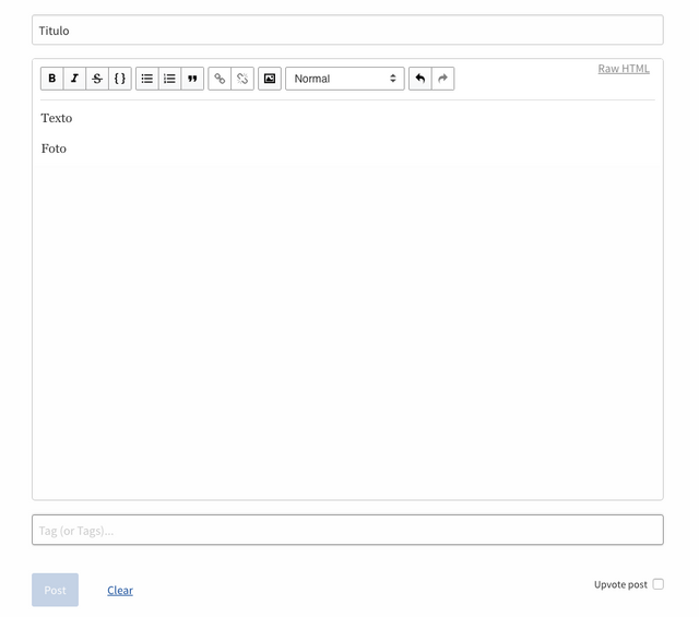 9) Pinchamos en editor para que nos salga las opciones de negrita, cursiva , fotos. Si pinchas en "Markdown", es como si fuera html, puedes pegar el código de Youtube o de un Gift.