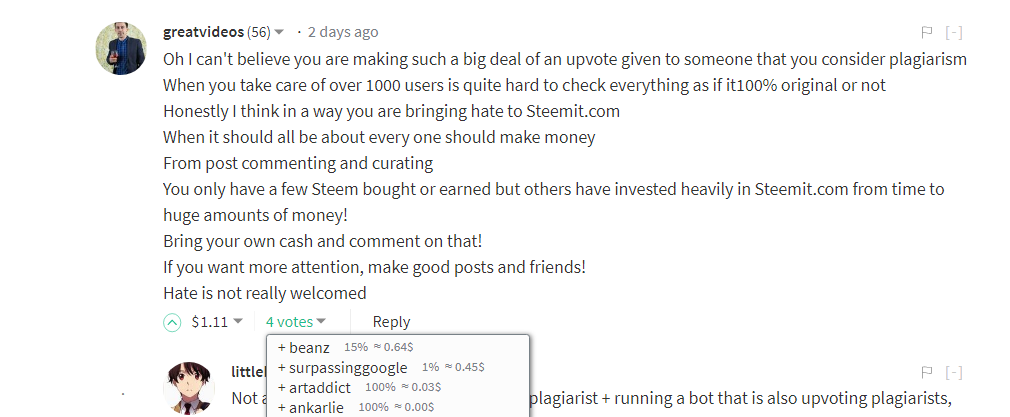 You also talk about voting bots well as @surpassinggoogle describes in his comment that these are still in the testing phase, well i have a question if 0.001$ upvote is destroying the reward pool then what is your opinion of 10$ upvote, why not you spread your voice to stop real shit going on in steemit, why not you are stopping or posting against those peoples who are selling their votes and upvoting shit comments and shit posts just for fulfill their greedy nature, here is the proof below.