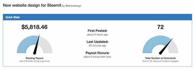 When you view a post the first thing you will see at the top of the dashboard is a Quick Stats Panel. This panel will include several graphical modules that give the user a snapshot of key metrics related to the post. At the moment the Quick Stats Panel has only 3 individual modules: 1) Pending Payout; 2) Time Stats; and 3) Total Number of Comments made directly on the post. If developed further the dashboard should include a Total Payout module and a Vote Count module at a minimum. Additionally, the user should have the ability to customize goals for the post. For example, the existing Pending Payment Gauge goes from 0 to $10,000. This should be customizable as each post is unique.