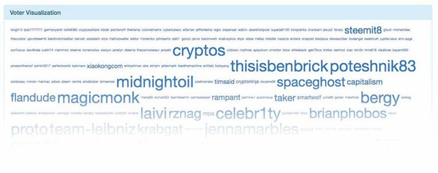 The third panel displayed on the dashboard is the Voter Visualization Panel which displays a cloud of all post voters. The current logic is a bit flawed and further development will need to fix this. Regardless the concept is the same - provide a picture of which voters on a post carry the most weight. To some this may seem like a way of trying to ‘catch a whale’, but for me personally this is powerful information to have at my disposal. I have only been a Steemit member for a couple of weeks, but since joining I have become extremely passionate about learning as much as I can about Steem and the Steemit ecosystem. Whales, and even above average users, are likely to possess this knowledge and therefore I have been trying to fish out their blog feeds. The Voter Visualization Panel helps assist with this.