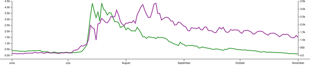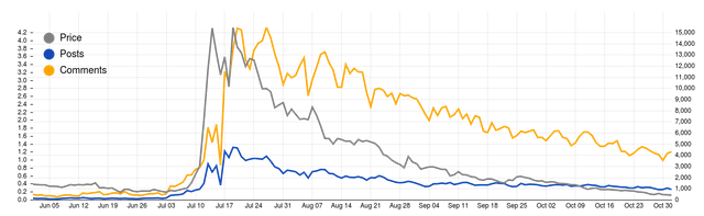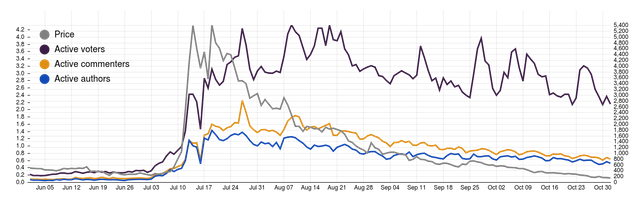This charts provides data on long (since 2016/06/01) and medium (last 30 days) term active users (defined as those who has made at least one resteem, following, post or comment) and price.