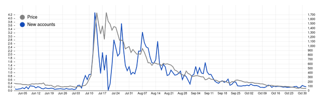 Chart is based on number of new accounts grouped by the created date. Only accounts that posted, commented or voted at least once are included are counted towards the total/
