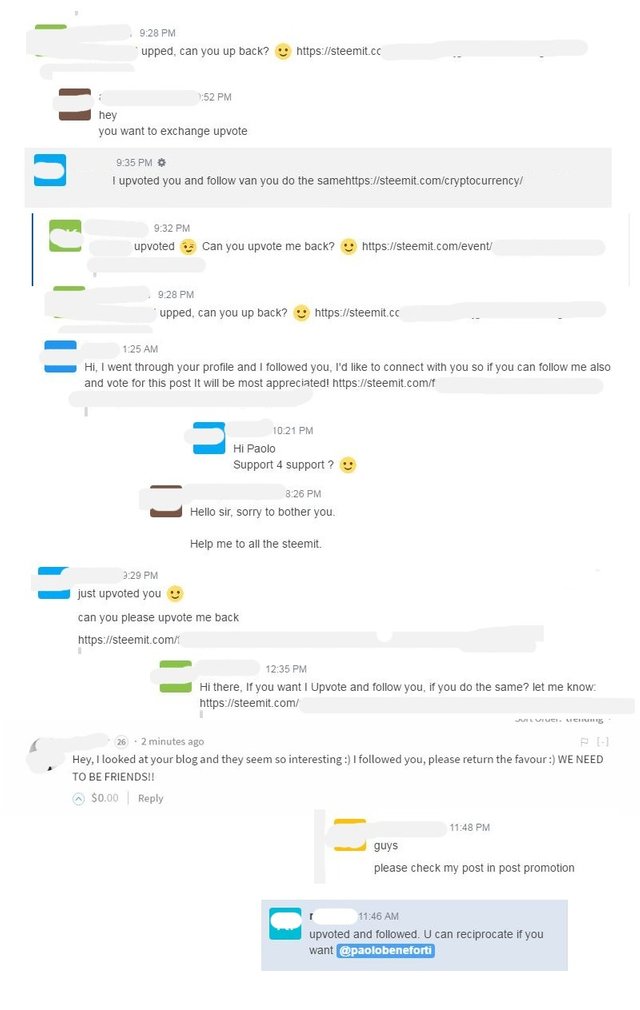 I cannot agree more. On comments I just don't give an upvote to the comment and I do not respond to the comment; Two things I generally give and do to comments. On private chat promotion, I either post the link to this post I created some time ago, or mute/blacklist them. With more and more newbies coming in we will see this more and more, so I think we need to get something organised in Steemit, maybe a kind of a cheetah bot that auto respond to comments with words like 'upped' in it or something; Count the number of times a users had these typeof words in his/her comments and when above a certain level (eg 5 in 5 days), then auto comments, flagging or whatever needs to be done. Or a guild that only go after the comments with these bad ways of asking for follows and votes.