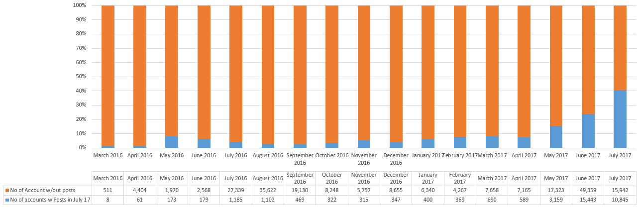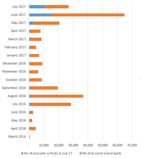 I found that so far in July 35,656 accounts have made at least 1 post this month. I used Power BI to work with the data and preformed a simple count on the number of rows in the table that had a post date of 1 July 17 to date. This is only 14% of the total registered accounts.