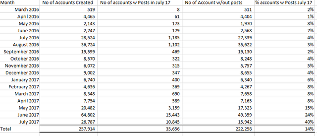 Well these accounts are not all inactive. Some people don’t post, just vote (Some of which would be voting bots). I think my next analysis will be on the accounts that have not posted, see if I can get a better understand. Obviously I will share the results with you!