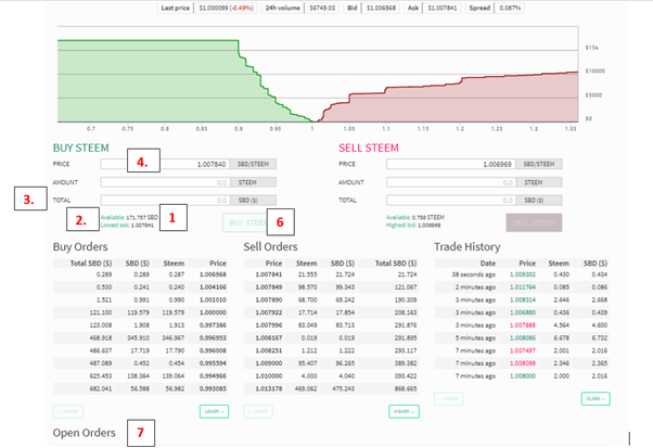 Once you have entered all the details of your order all you need to do is select BUY STEEM (6.) You will be promoted to log in and then the order will be placed. You will find all of your open orders at the bottom of your screen (7.)