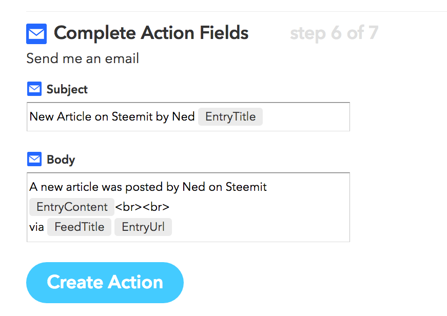 Once your mail account is linked, the set up of a mail recipe is done in a few seconds.