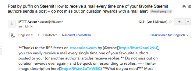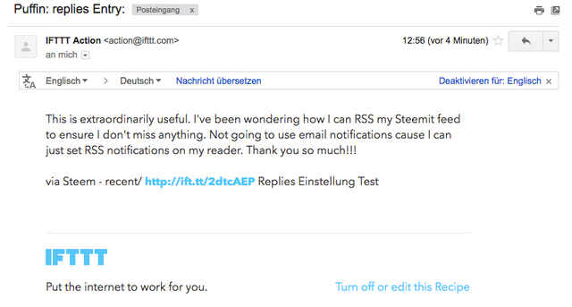 Here is how the mail looks like that was just sent out for this post - for a recipe I created with my Steemians RSS feed (https://streemian.com/rss/@puffin) - for testing purposes:
