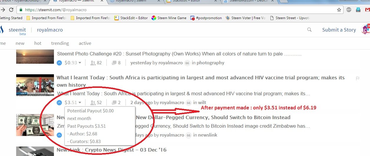 But, when payment was made then I was paid only 9.65 USD. Same thing happened with the next post https://steemit.com/newslink/@royalmacro/newslink-zimbabwe-unleashes-new-dollar-pegged-currency-should-switch-to-bitcoin-instead