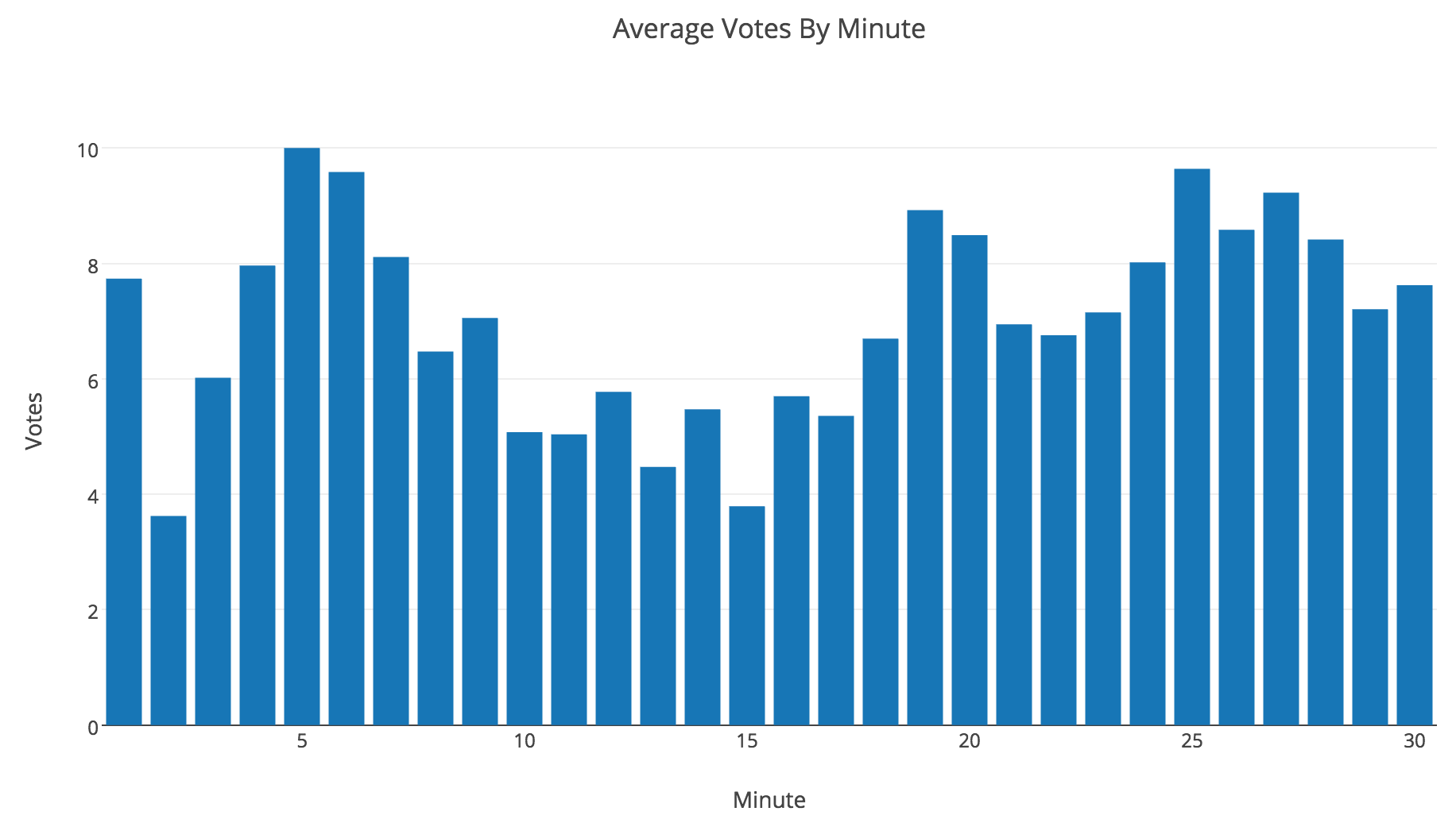 Wow! I just love significant results. There is a huge spike after minute 15, which is maintained the rest of the way. It's important to note here that these are not minutes elapsed, meaning that minute 1 goes from 0:00-0:59 and minute 15 really goes from 14:00-14:59. Therefore, minute 16 on these graphs is when the curation reward penalty drops below 50%. Remember, though, that the curation reward penalty is a continuous linear function going from 100% to 0% over the first 30 minutes. It is a smooth, constant decline in penalty. It seems to me like there is some human psychological bias going on here. The way the curation reward calculation was announced, people seemed to consistently make specific mention of the 15 minute mark, even though that point in the function is completely arbitrary. It's just a pleasant way of breaking it down mentally. This spike could simply be due to a natural human tendency to break things up into halves. It seems people are weighing the tradeoff between voting too early and incurring a high penalty, and waiting too long and missing out, and they've generally decided that they should wait until the penalty drops to at least 50%. There is a lot of activity from bots, but it's important to remember humans make bots and build in their own human biases when they do so.