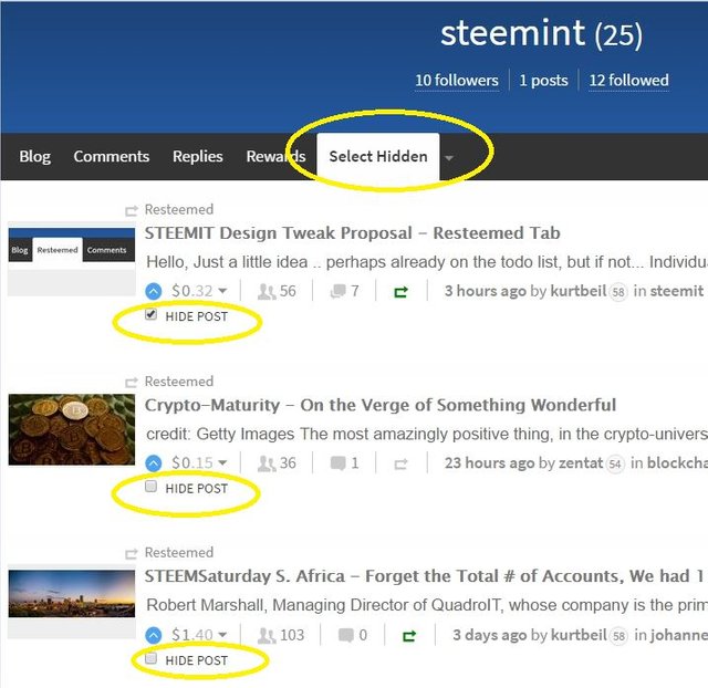 STEEMIT Design Tweak - Option to Hide Posts! (inspired by @kurtbeil)