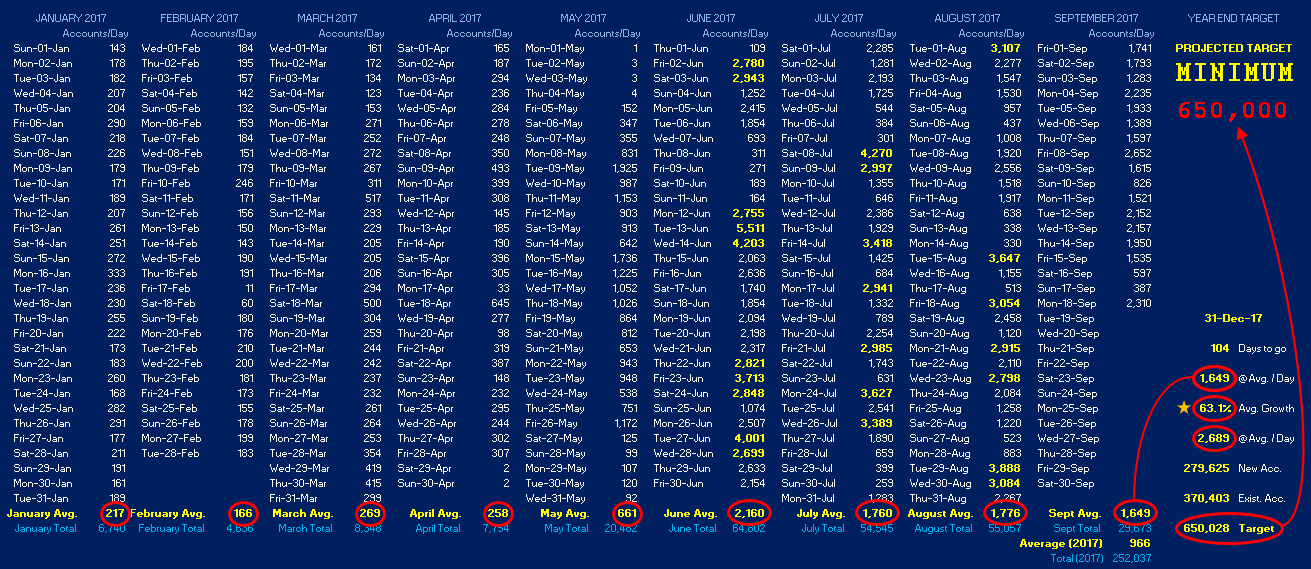To put things into perspective, the last time the numbers were presented, September was showing an average of 1,775 new accounts per day and we had 108 days to go.
