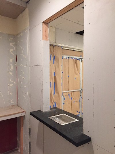 In the front room, the window opening had the quartz base with stainless steel tray installed. The glass should be coming any day now. There a few minor details that need to be done before proceeding to the taping and mudding of the drywall. I will repost again to show you how that comes along.