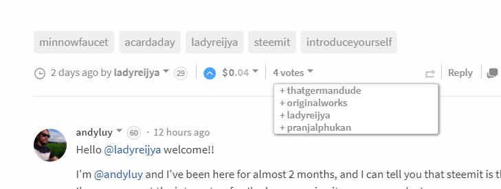 Upon visiting Lady Reijyas's introduction post I encountered @andyluy (Rep 60)(6000SP including distributed power) and a very unpleasant encounter it was: An automated comment talking about his experience on Steemit, linking several of his articles. About a page of text in print. He used @randowhale to upvote it and upvoted it himself.