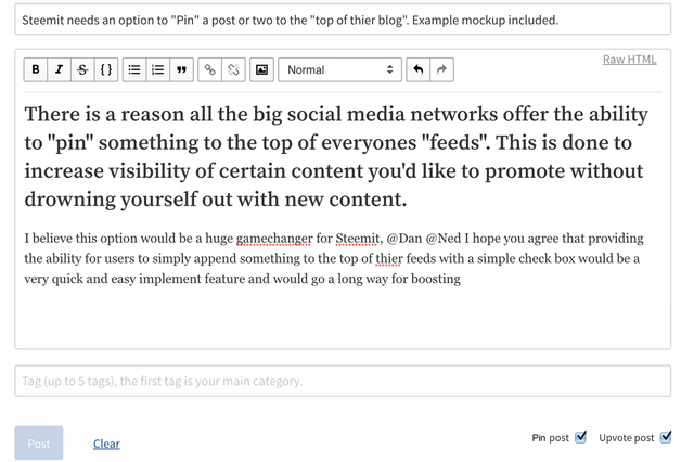 Me and @lovenugz were talking the other day and she brought up the ability to "pin" items to her profile being something she hoped would be added & I believe this option would be a huge game changer for Steemit, @Dan @Ned I hope you agree that providing the ability for users to simply append something to the top of thier feeds with a simple check box would be a very quick and easy implement feature and would go a long way for boosting usage, content rediscovery and mostly just give people more reason to write time-tested content.