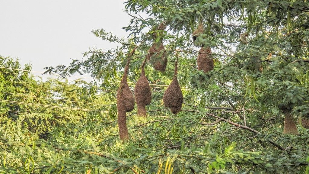 A weaver bird gathers large amount of grass blades, palm frond strips, thin long roots etc. By my estimate, one nest with an average diameter of about 4 inches and length of about 18 inches may need more than 600 feet of grass strips.