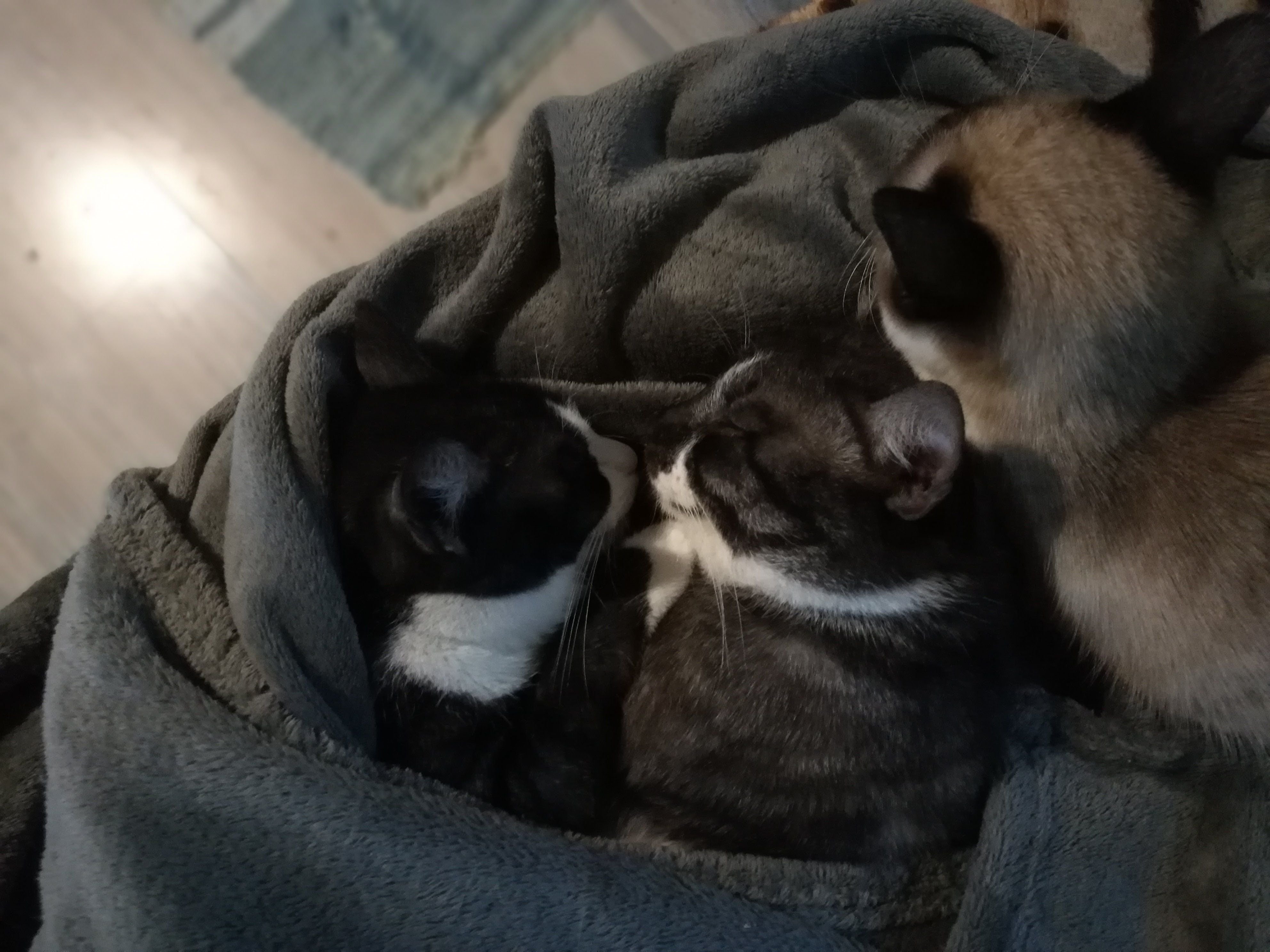 They like to cuddle. A lot. Most of the times they sleep together because it's much warmer than sleeping alone. There are of course loners too. Some don't like the company of others so much so they spend their days in the stairway or bathroom completely alone. Surrounded by dark.