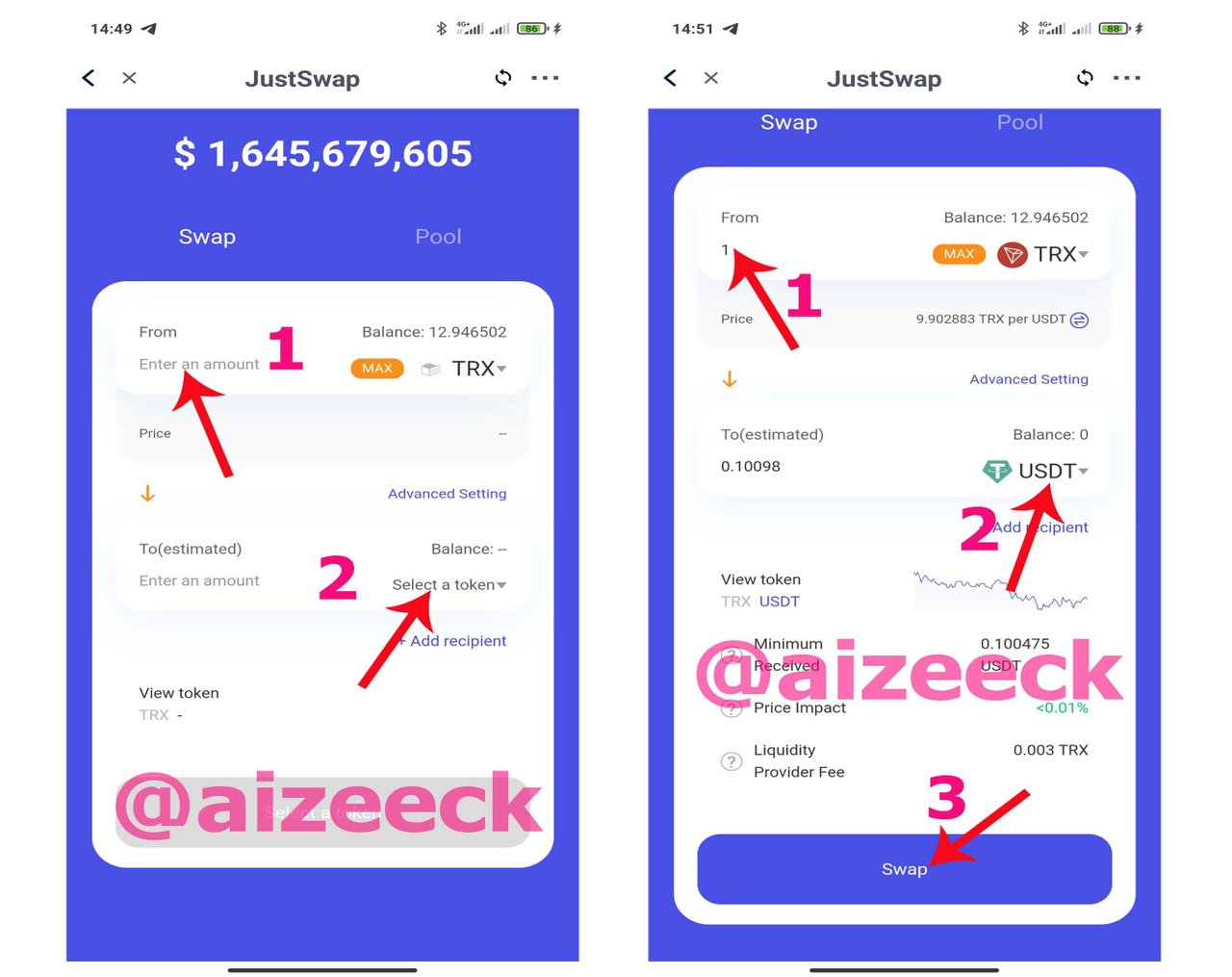 In the left hand side screenshot; 1 is the summary of what I want to swap 1 TRX to 0.100981 USDT.