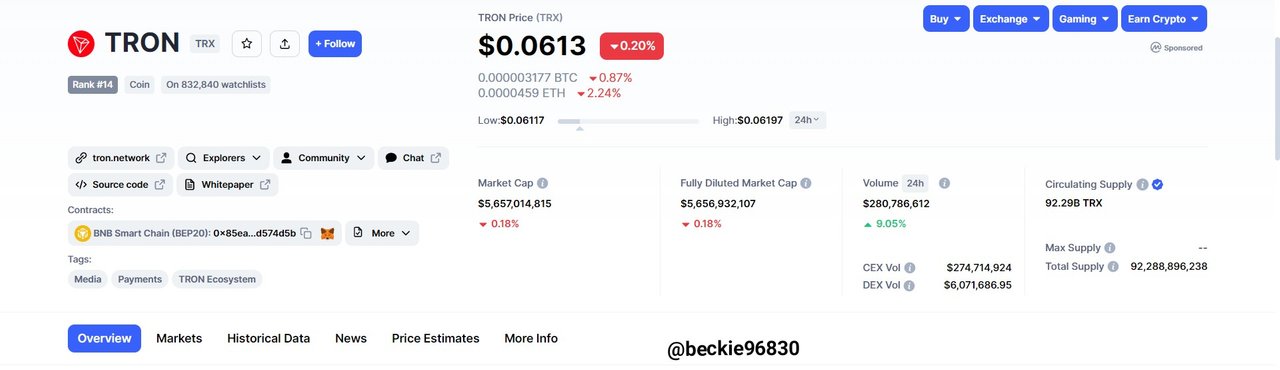 TRX's statistics according to coinmarketcap show that the current price of TRX against the US Dollar as at the time of this research is $0.0613. TRX has a trading volume of $280.7M in the last 24 hours and a market capitalization of $5.6B.