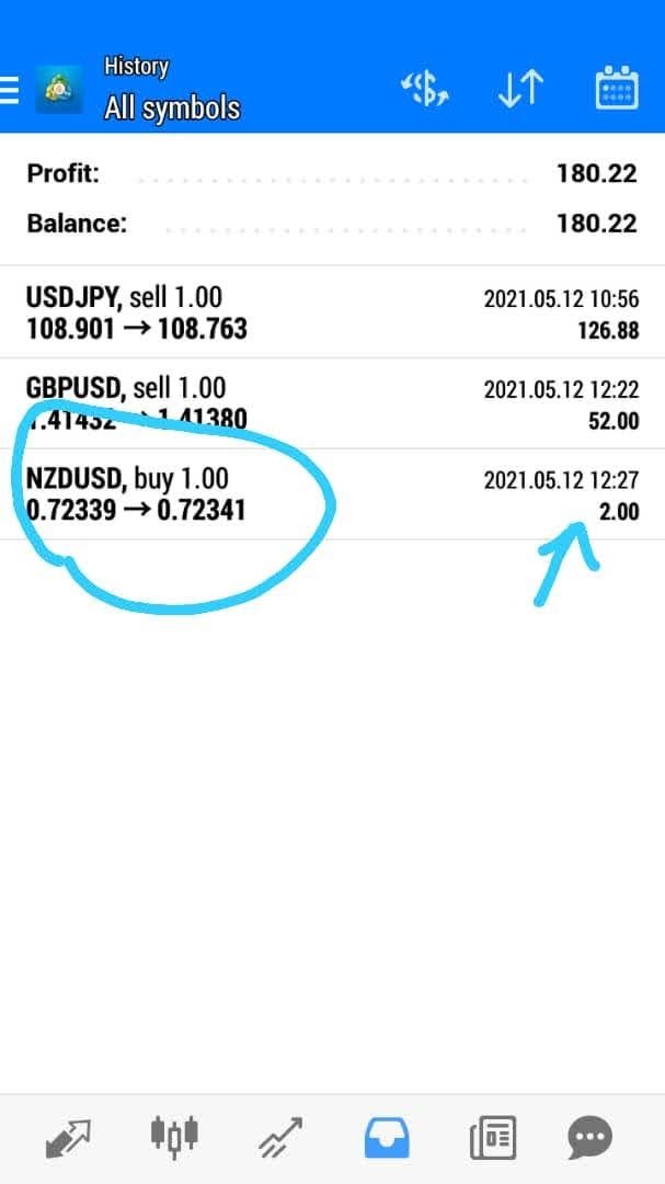 The above screenshots are still from my MT4 trading app,from the first screenshot i was able to indicate the time and after the set up, i went long on a market with 1:00 lot that is placing a buy and i monitored it and was able to close with a profit of 2pips in few minutes of the trade;