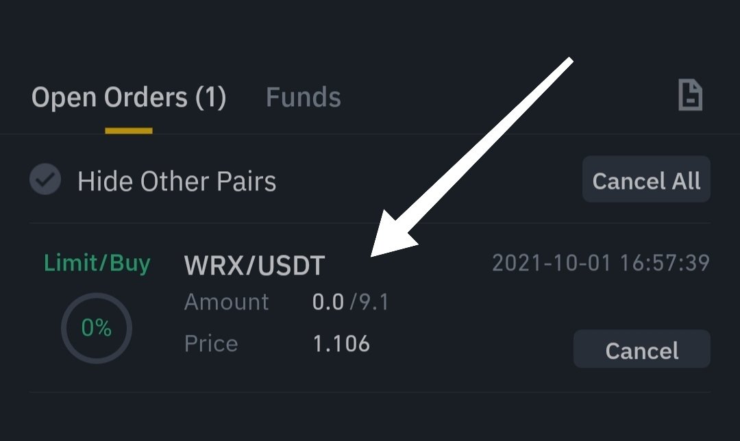 To perform transaction, I'll purchase WRX coin for 10 USDT on BINANCE and sell it on WazirX . So i open Binance markets and select spot trade and search for WRX/USDT pair. Next I'll be entering amount of USDT as 10 . For 10 USDT , i got 9.1 WRX. Place buy order and order is executed shortly. I have shown pending order and 0 WRX balance before order execution. And 9.1 WRX after executiom of order.