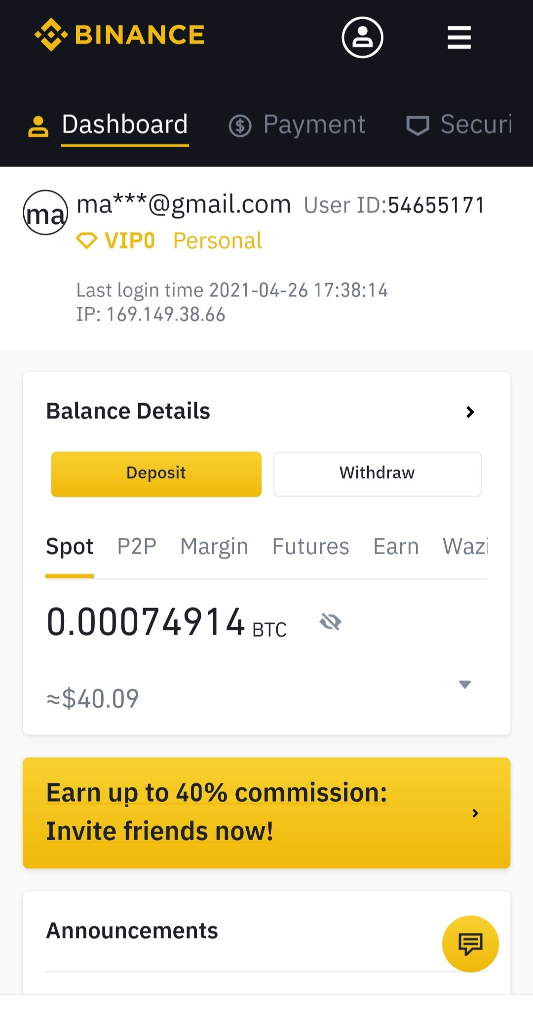 My Binance profile, you can see, i still have 40$ worth of BTC