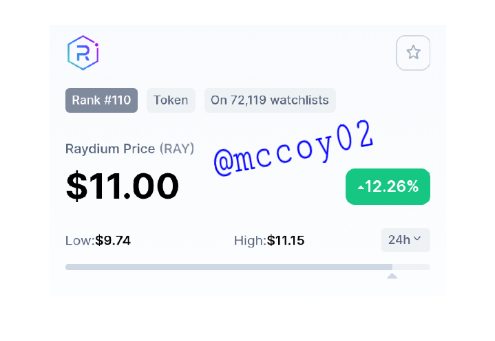 RAY coin is ranked #110 according to coinmarketcap ranking with a current price of $11 at the time of writing this post it has a 24hr trading volume of $228,623,856 with a market capitalization of $781,522,491 the coin has a circulating supply of 71,106,794 and a maximum total supply of 555,000,000 RAY coins.