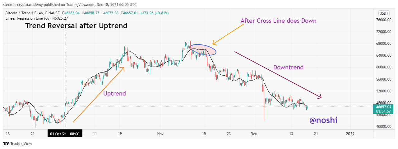 We can easily predict and determine the bullish and bearish signal by observing the crossings of linear regression indicators. can predict the bullish and bearish market by the intersection of indicator line and price candles. After the intersection, the line changes its path.