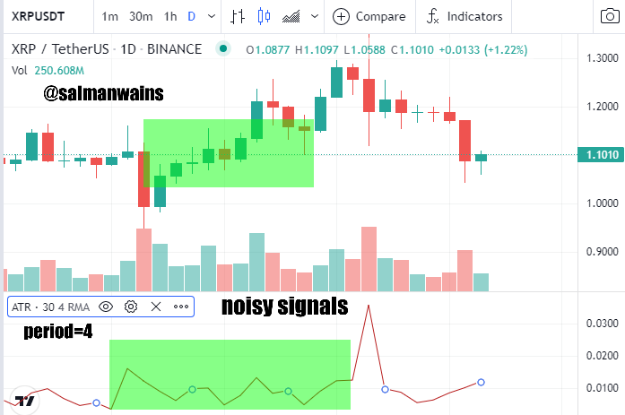 In the chart above we are using the 4 time period of ATR and we can appreciate the formation of fake and noisy signals that are not too reliable. The price is still trending up when the ATR is showing unnecessary highs and lows.